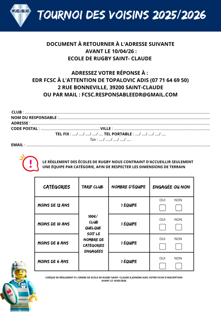 Nous vous remercions de bien vouloir confirmer votre participation avant le 10 avril 2026, en nous retournant le formulaire d’inscription complété, accompagné de la contribution du club engagé.