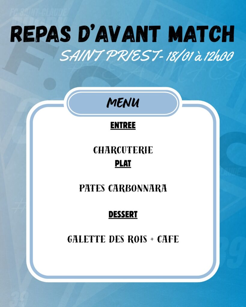 Réservation Réservations repas chapiteau 18 janvier 2026Match F.C.S.C – St PriestCharcuteriePates carbonaraGalette des roisCafé Nom Prénom Nombre de personnes Date Téléphone Email Message envoyer votre réservation