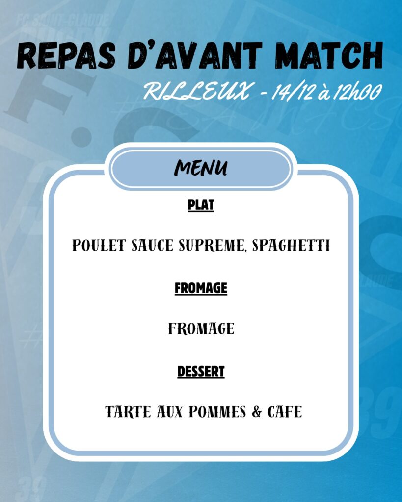 Réservation Réservations repas chapiteau 14 décembre 2025Match F.C.S.C – RillieuxPoulet sauce suprême/spaghettiFromageTarte aux pommesCafé Nom Prénom Nombre de personnes Date Téléphone Email Message envoyer votre réservation