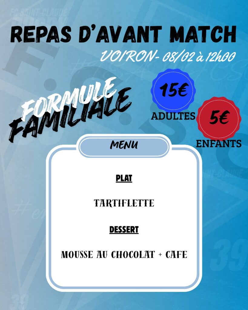 Réservation Réservations repas chapiteau 8 février 2026 Match F.C.S.C – Voiron Tartiflette Mousse chocolat Café Nom Prénom Nombre de personnes Date Téléphone Email Message envoyer votre réservation